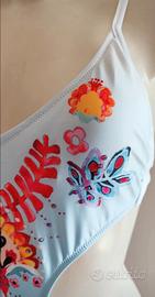 Splendido costume intero modello monokini firmato Amarea, brand leader nel beachwear italiano. Il costume presenta una bellissima base color azzurro polvere con una vivace stampa d'ispirazione folk/etnica nei toni del rosso, arancio e giallo. Dettagli di stile: Tagli laterali (cut-out) che valorizzano il punto vita e schiena quasi interamente scoperta. Vestibilità: Spalline sottili regolabili e chiusura posteriore con laccio per un fitting perfetto. Condizioni: Assolutamente nuovo con cartellino, mai indossato. Taglia: M (42/44 italiana). Perfetto per chi cerca un look unico, elegante e colorato per l'estate! #Costume #Mare #Amarea #Monokini #M #Nuovo #Bikini #Estate #Piscina #ModaDonna #Style #EtnicLook