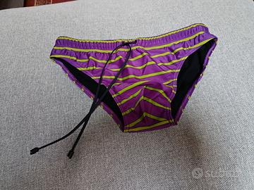 Costume da uomo, modello slip realizzato in Italia in tessuto sintetico. Non tira e non stringe. Un vero e proprio must have per l'estate. Iconica fantasia a righe multicolor Gallo nei toni del viola. Per i tuffi in mare o in piscina più divertenti e colorati dell'estate. Slip mare righe multicolor viola e verdi.