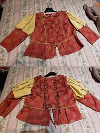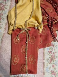 Costume storico rinascimentale indossato per sfilate con gruppo storico, di epoca fine 1500. Cucito interamente a mano da costumista. Realizzato in tessuto damascato e arricchito di preziose passamanerie e perle finte. La gonna si può allungare.