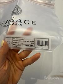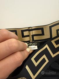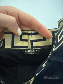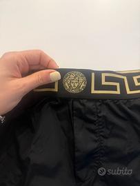 Costume da bagno uomo Versace modello boxer, colore nero con iconica greca oro. Taglia: italiana 3 / europea S / francese 2. Realizzato in 100% poliammide (PA), tessuto leggero, resistente e ad asciugatura rapida. Vestibilità comoda con elastico in vita. Condizioni: Usato Poco Perfetto per mare o piscina, stile elegante e riconoscibile. Disponibile per scambio a mano zona La Spezia o spedizione