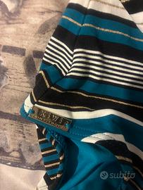 -Costume intero a righe color petrolio, nero e bianco marca kiwi taglia 40.