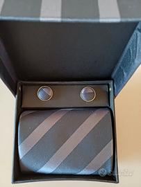 Cravatta rigata nelle tonalità del grigio con gemelli abbinati di colore ideale per cerimonie