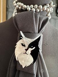 Bellissima cucita a mano Spilla 3D gatto Mischetyone acciaio Collana vetro Pezzo unico