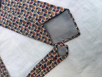 Cravatta uomo di Sghevit in 100% seta. Di base blu notte molto scuro con fantasia ocra, verde salvia e bordeaux. Più che ottime condizioni.