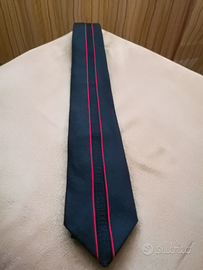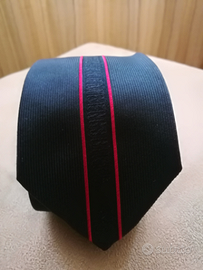 Nello stile unico di Dirk Bikkembergs stupenda cravatta nera slim con logo Bikkembergs continuo per la lunghezza della cravatta con 2 sottili righe rosse ai lati.