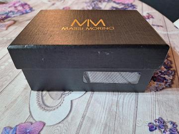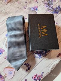 Confezione di Massi Morino con cravatta a striscia grigia, gemelli, fazzoletto da taschino, fermacravatta color argento, mai utilizzati e scatola originale.