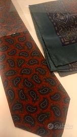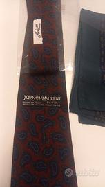 Cravatta e fazzoletto da taschino (pochette), entrambi del marchio di lusso Yves Saint Laurent. Entrambi gli accessori sono realizzati in seta e presentano fantasie paisley.