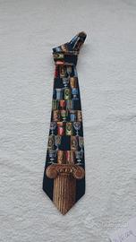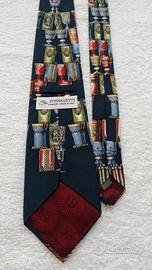Un’architettura di stile firmata Fornasetti. In questo pezzo d'archivio, l’eleganza neoclassica delle colonne si fonde con la convivialità di calici decorati, creando un pattern che è pura arte visiva. I colori vibranti su fondo scuro rendono questa cravatta perfetta per il periodo di Carnevale, richiamando i fasti dei grandi banchetti e dei balli in maschera nei palazzi storici. È un accessorio per il collezionista che cerca un pezzo capace di raccontare una storia di cultura e bellezza italiana a ogni nodo. Made in Italy