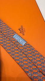 Vendo da collezione privata cravatta Hermès NUOVA, mai usata e sempre tenuta in armadio, nella sua confezione originale. Colore di fondo arancione con fantasie di piccole catene, iconiche del marchio. Lunghezza 153 cm larghezza 7,8 cm. La scatola e il nastrino non sono inclusi nel prezzo ma possono essere acquistati, richiedendoli in chat al momento dell'acquisto, aggiungendo 10 €.