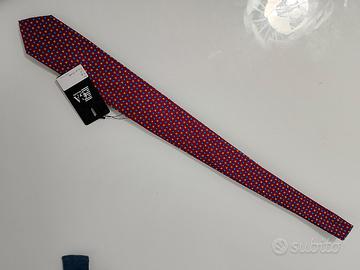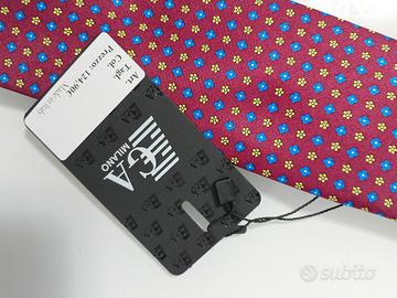 cravatta nuova con cartellino confezionata ega Milano prezzo di acquisto 124,90 prodotto 100% made in Italy colore rosso Borgogna con motivi geometrici ocra e azzurro