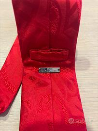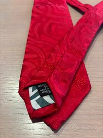 Cravatta originale John Richmond, colore rosso intenso con elegante motivo jacquard tono su tono. Dettaglio interno con fodera zebrata e passante in tessuto con logo in metallo. 100% Seta. Made in Italy.