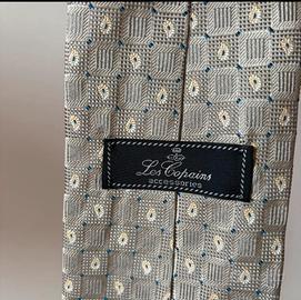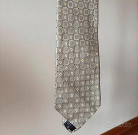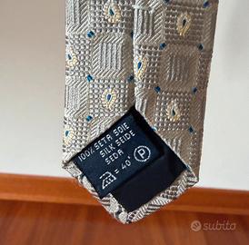 Splendida cravatta firmata Les Copains Accessories, un classico del Made in Italy. Il design è raffinato e versatile, caratterizzato da un motivo geometrico a piccoli quadri con micro-disegni paisley (a goccia) color panna e dettagli blu su base grigio caldo/tortora. * Materiale: 100% Seta (Seta/Silk/Soie). * Condizioni: Ottime, pari al nuovo. Non presenta macchie, fili tirati o segni di usura. * Dettagli: Etichetta originale presente, passante posteriore logato, fodera interna nera di alta qualità. * Stile: Perfetta per contesti formali, business o cerimonie. Si abbina facilmente ad abiti blu, grigi o neri. Spedizione rapida e imballaggio curato per evitare pieghe.