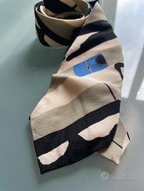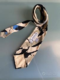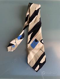Elegante cravatta con un design moderno e accattivante. - Fantasia a righe diagonali con inserti geometrici. - Tonalità predominanti di beige e nero, con un dettaglio blu. - Tessuto leggero e fluido.