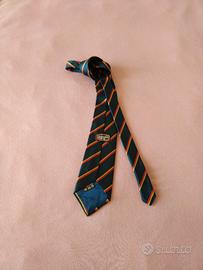 Cravatta Ermenegildo Zegna in pura seta 100%, colore blu scuro con righe oblique rosse e gialle. Utilizzata ma ancora molto bella e in buono stato.