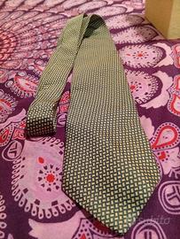 bellissima cravatta in seta strutturata disegno molto chic nei colori verdone e senape indossata ma senza difetti