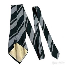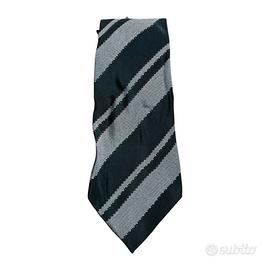 Il pattern è un’interpretazione sofisticata del classico motivo Regimental, caratterizzato da ampie bande diagonali. La palette cromatica gioca su un contrasto profondo tra il nero antracite e il grigio perla metallizzato, quest'ultimo impreziosito da una trama a micro-nido d’ape che conferisce tridimensionalità e una lucentezza discreta sotto la luce. Sottili profili color ruggine/terra di Siena delimitano le fasce, aggiungendo un tocco di calore cromatico che ne eleva la complessità.