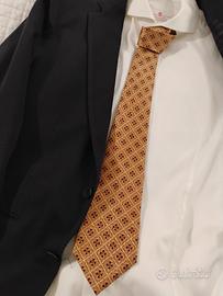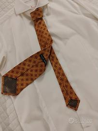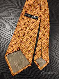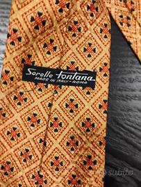 Firmata dalla storica maison romana Sorelle Fontana, protagonista del grande racconto del Made in Italy dagli anni ’40 in poi, quando vestire bene era quasi un atto di fede. NO Poste Italiane 🚫 Realizzata in pura seta, si distingue per una fantasia a rombi ritmata, attraversata da piccoli motivi geometrici rossi e neri che evocano, con discrezione, la forma della croce di Malta. Un dettaglio sottile, che non ostenta ma si fa notare da chi sa guardare. La fodera interna è impreziosita da un elegante effetto moiré, con il brand ripetuto, un segno di cura artigianale, di quelli che oggi si vedono sempre meno. Perfetta per cerimonie, eventi formali o abiti sartoriali, accompagna lo stile con classe senza eccessi. MISURE Lunghezza: 130 cm Larghezza: 5 cm (lama stretta) – 10 cm (lama larga) Ottime condizioni sembra nuova, nessun odore conservata in una casa di non fumatori. Ultime due foto disponibile altro modello, lo trovi in vendita tra gli annunci. Spedizione accurata e veloce