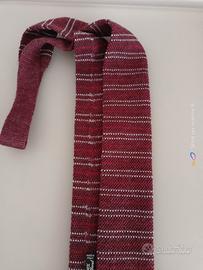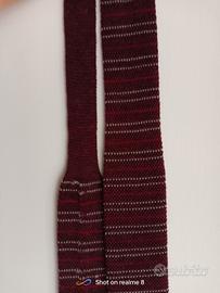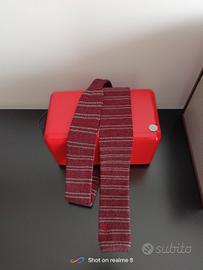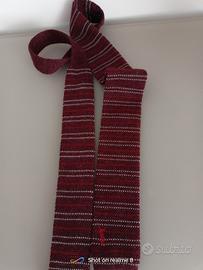 Cravatta in lana Yves Saint Laurent con monogramma ricamato. Fondo bordeaux con righe rosse e bianche.