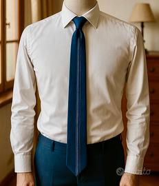 Raffinata cravatta Zarlini in colore blu navy, caratterizzata da un design sobrio e moderno con doppia banda verticale a motivo micro-geometrico.