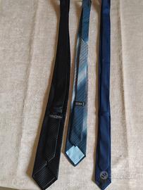 lotto n. 3 cravatte, una nera in poliestere, una blu in seta , l' ultima a righe trasversali,con tinte sfumate che vanno dal colore aviazione al celeste, avorio, poliestere 100%