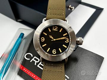 Raro Crepas Hydrographer Diver 1942 mt Impermeabile 194 Atmos Corona a ore 03:00 Cassa satinata 45 mm interamente in acciaio Quadrante Phantom Super Luminova Old Radium Swiss Made a ore 6 Vetro Zaffiro Ghiera unidirezionale 120 scatti Automatico ETA 2892-2 Fondello a vite con valvola al centro e Limited Limited Edition a 499 pezzi SOLD OUT da molto tempo Completo di scatola, contro scatola, garanzia, cacciavite e panno in micro fibra Orologio da collezione, creato sulla base del Longines Hydrographic Survey per la marina militare Britannica
