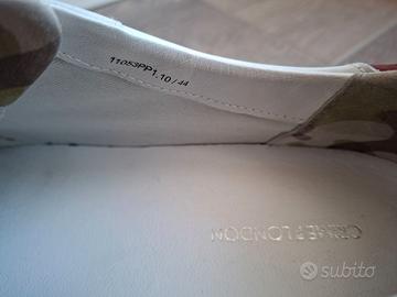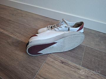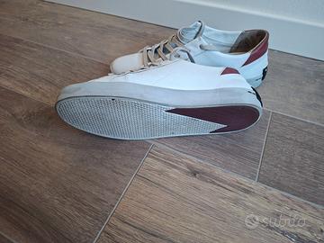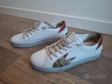 Scarpe originali Crime London, modello Storm. Tomaia in pelle bianca liscia con inserti laterali e interni camouflage in scamosciato. Effetto distressed originale dell’intersuola, tipico dello stile Crime London. Le scarpe sono state indossate circa 10 volte e si presentano in ottime condizioni generali: pelle ben conservata, struttura della tomaia integra e intersuola con il normale effetto used previsto dal modello. La vendita è dovuta esclusivamente alla vestibilità: nonostante siano state indossate diverse volte, risultano ancora corte per il mio piede.