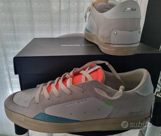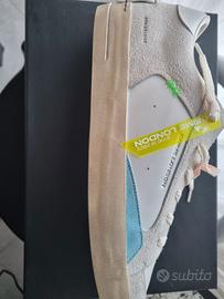 NUOVE CON CARTELLINI E INTROVABILI!! Tomaia in pelle bianca con profili in suede grigio chiaro, tallone in pelle bianca e dettagli in suede celesti Effetto distressed su tomaia e suola Linguetta in pelle arancio con label logata e testo stampato "Beyond The Streets" Patch in pelle sul retro fissato con micro viti Lacci off white Unico tag lime logato in gomma e palme stampate Fodera in pelle e tessuto