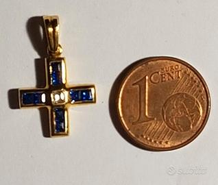 Splendida croce in oro giallo 18 kt (2 grammi) di Chimento con pietre preziose naturali: diamante (da 6 punti di carato) e 8 zaffiri blu (da 52 punti di carato complessivi).