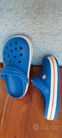 Crocs Clog usati pochissimo, condizioni perfette, blu banda rossa, taglia J1 US; 32-33 EU;31/32 taglia italiana suggerita; lunghezza piede 7 7/8 inches / mm 200
