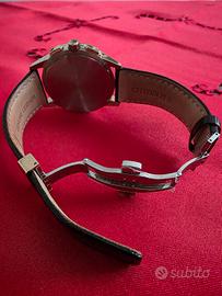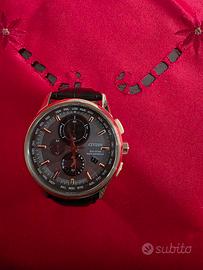 Cronografo CITIZEN con movimento Eco Drive a carica infinita. Radio controllato. Cassa in acciaio placcato oro, vetro zaffiro, cinturino in pelle marrone originale.