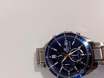 Casio edifice cronografo solare acciaio water resistance 10 bar, apertura cinturino semplice da i lati con pulsantini, non necessita di ricarica in quanto solare funziona perfettamente, lancette visibili anche al buio nessun graffio, struttura massiccia ed elegante sportiva.