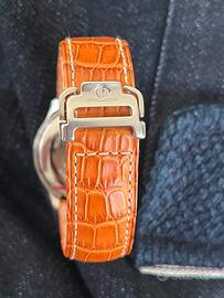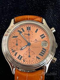 Oggi metto in vendita un orologio acquistato pochi giorni fa d’impulso e che merita un polso piu’ maturo del mio: si tratta di in bellissimo cronografo Baume & Mercier che potrete apprezzare di seguito, appartenente alla linea Baumatic e prodotto nel 1999. Incassa un movimento automatico basato sul calibro ETA 2892-A2 con modulo cronografico Dubois-Dépraz. La cassa e’ In acciaio inossidabile con un diametro di 36,5mm ideale per uno stile unisex o classico maschile. Funzioni: Cronografo a tre contatori (ore, minuti e secondi continui) e finestrella della data a ore 3 con lente d'ingrandimento integrata nel vetro. Presenta una lunetta liscia fissa a più livelli ed un quadrante salmone con indici a numeri romani blu cobalto che conferiscono un aspetto vintage e sofisticato. Orologio veramente molto bello proprio per questi ultimi aspetti. Cinturino e fibbia originali e perfettamente abbinati. E’ scontato dire che si tratta di in orologio nuovo, indossato solamente per foto e completo di tutto il suo corredo.