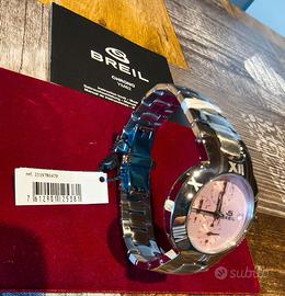 Ormai introvabile cronografo Breil da donna con quadrante rosa, appartenente alla collezione LUX di Breil ref. 2519780479. Un ottimo regalo per la tua Lei. Queste le caratteristiche: Movimento: al quarzo Miyota OS10 Display: Analogico Funzioni: Cronografo, ore, minuti, piccoli secondi e giorno data Impermeabilità: 10 ATM Materiale cassa: Acciaio Colore cassa: Acciaio Colore quadrante: Rosa Materiale cinturino: Acciaio con chiusura a scomparsa con pulsanti di sicurezza. Diametro cassa (mm): 36 L'orologio non è mai stato indossato, presenta ancora le pellicole sul bracciale e completo di cartellino originale. Vetro e cassa impeccabili, batteria nuova. Venduto set come in foto (no scatola). Da mia collezione privata.