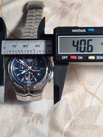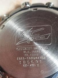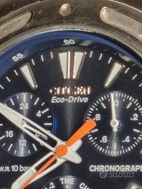 Citizen Eco-Drive Chronograph, modello sportivo multifunzione, molto robusto, appartenente alla serie calibro E812 o similari. Il cuore dell'orologio è il sistema Eco-Drive. Non necessita di sostituzione della batteria perché si ricarica con qualsiasi fonte di luce naturale/artificiale. L'orologio è un cronografo multi funzioni, visualizzabili attraverso i tre piccoli sotto-quadranti: Sotto-quadrante ore 10: Indicatore delle 24 ore. Utile per distinguere il giorno dalla notte. Sotto-quadrante ore 2: Contatore del cronografo (fino a 1/20 di secondo). Sotto-quadrante ore 6 (Selettore Modalità): Questa è la "centrale di controllo". Ruotando la corona si può scegliere tra: TME: Ora locale. CHR: Cronografo. L-TM (o AL-1 / AL-2): Orario secondario o impostazione delle due sveglie disponibili. La dicitura W.R. 10 bar indica che l'orologio è impermeabile fino a 100 metri. È adatto per il nuoto e lo snorkeling, ma non testato. Allarme: Dispone di una funzione sveglia (indicata dalle scritte AL-1, AL-2 e gli indicatori ON/OFF sul bordo sinistro del quadrante). Cassa e cinturino in acciaio inossidabile con una ghiera fissa dal design "bullonato" molto caratteristico. Lancetta dei secondi arancione: Utilizzata principalmente per la funzione cronografo per un'alta leggibilità. Indici e lancette sono trattati con materiale luminescente per la visione notturna. Consiglio utile: Se hai bisogno di impostare l'ora o la data, ricorda che su questi modelli Citizen la corona deve essere estratta di uno scatto per ruotare il selettore delle funzioni (il quadrante a ore 6) e di due scatti per le regolazioni effettive. Orologio con tutte le sue maglie originali, tiene perfettamente il tempo, nessun segno di usura nè graffi, come nuovo. Fornito di scatola originale.