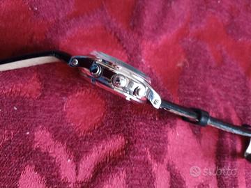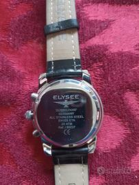 Cronografo Elyse cassa in acciaio, movimento al quarzo, (batteria da inserire) quadrante nero e bianco, cinturino in pelle nero con cuciture bianche. Modello non più in produzione, quindi ricercato. Vedi sito ufficiale Elyse. Prezzo e modello per intenditori perché fuori produzione.