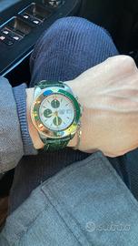 Orologio vintage Galanti Milano pezzo unico tenuto con cura cassa in acciaio da 40mm subaqueo 100mt colore verde e bianco con cinturino verde in vera pelle ha ancora la pellicola sul fondello listino 175 batteria da sostituire.