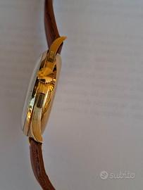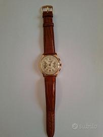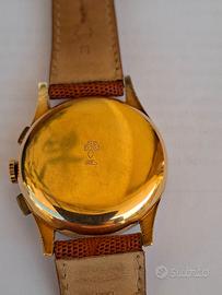 Cronografo oro giallo 18KT IMPERIOS con cinturino in pelle, epoca 1950. L’orologio ha un movimento meccanico a carica manuale ed è perfettamente funzionante. La cassa misura in larghezza compresa la corona mm 37.56, in altezza mm 34.89 e lo spessore è mm 12.36.