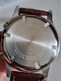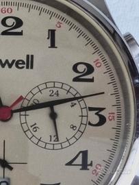 Orologio firmato Lowell, un marchio italiano (modenese, per la precisione), stile classico con un'ottima attenzione ai dettagli. Cronografo piacevolmente "rétro", che ricorda i vecchi orologi da aviatore o ferroviari. Il quadrante color crema (avorio) abbinato ai numeri arabi neri in grassetto conferisce un look d'epoca molto leggibile. Il cronografo presenta tre sotto-quadranti: A sinistra (ore 9): contaminuti del cronografo. A destra (ore 3): Indicatore delle 24 ore. In basso (ore 6): contatore dei secondi. Spicca la sfera dei secondi cronografici rossa, un dettaglio sportivo che spezza il rigore del quadrante. Sono presenti anche piccoli numeri rossi per la scala dei minuti/secondi esterna. La finestrella del giorno del mese è posizionata a ore 6, sotto-quadrante inferiore. Cassa in acciaio inossidabile con finitura lucida. Vetro minerale bombato, tipico di questo stile. Cinturino in pelle marrone con stampa "coccodrillo", che accentua l'eleganza classica dell'orologio, non Lewell !! Orologio perfettamente funzionante, come cronografo, tempo e data, nessun segno di usura ne graffi, praticamente come nuovo. No scatola.