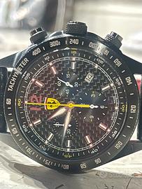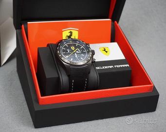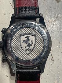 Cronografo svizzero logo Ferrari:color nero, vetro zaffiro, cinturino in vera pelle nero impunture rosse foggia fibra di carbonio, chiusura con logo Ferrari; comprensivo di scatola originale istruzioni d’uso , e certificato Ferrari.