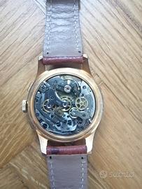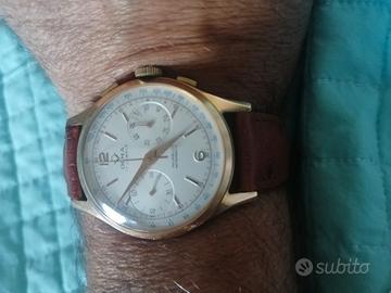 Splendido cronografo Olma, 38/39mm senza corona. Perfettamente funzionante. Cassa placcata oro 20 micron, fondello in acciaio. Morbido e bello il cinturno in pelle stampa struzzo. Movimento Landeron 248 marcato Olma, 17 rubini.