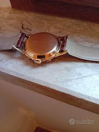 Descrizione: Vendo cronografo vintage anni ’50 in oro 18 kt (punzonato 0.750), in ottime condizioni generali. ✅ Meccanico a carica manuale – calibro Venus 175 (metà anni ’50), verificato da orologiaio. ✅ Cassa in oro 18kt con dicitura ANTIMAGNETIC (come da quadrante). ✅ Diametro cassa: 40 mm (esclusa corona). ✅ Quadrante chiaro con due contatori cronografici e scala esterna, molto elegante e di grande fascino d’epoca. ✅ Condizioni estetiche molto buone; l’orologiaio segnala che necessita solo di pulizia/manutenzione ordinaria. ✅ Cinturino in pelle (non necessariamente originale). 📌 Peso cassa: per il peso preciso è necessario smontaggio completo; l’orologiaio ha indicato che non può essere inferiore a 15 g. Prezzo: € 1700 (valuto offerte serie e coerenti) Consegna a mano a Roma/zona da concordare oppure spedizione tracciata/assicurata. Disponibile a inviare ulteriori foto/video (anche del movimento). Nota per appassionati: monta calibro Venus 175 (metà anni ’50), movimento cronografico svizzero molto apprezzato e ricercato nel vintage. Per questo l’orologio è interessante anche in ottica collezionistica, non solo per il valore dell’oro.