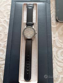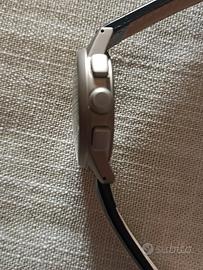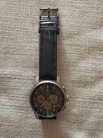 Cronografo OSCO Titan di produzione tedesca, caratterizzato da una cassa di mm. 42 in titanio con finitura opaca particolarmente leggera e resistente. Water resistent fino a 100 metri, come indicato nel quadrante di colore nero con indici circolari luminescenti e una finestra per il datario tra le ore 4 e 5. Movimento al quarzo (batteria da inserire) cinturino in pelle nera. Made in Germany. Nuovo mai indossato. Si tratta di un pezzo considerato raro, ricercato e distintivo per il suo design moderno.