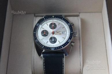 cassa in acciaio, tutta marchiata, vetro zaffiro, ghiera girevole con lamina blu, cronografo meccanico calibro valjoux 7750, fondello a vite, cinturino in pelle ansa 22 blu finiture bianche, corredato di cofanetto.