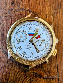 Cronografo Poljot Edizione Limitata Moscow Rome '92 - movimento Russo Poljot, calibro 3133, questo orologio COMMEMORATIVO del 1992 riprende una data storica, inerente agli accordi bilaterali internazionali, assolti fra Roma e Mosca. Ne furono fatti quindi 25.000 esemplari per l'Italia, che vennero importati e distribuiti da Visabilia.