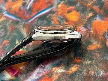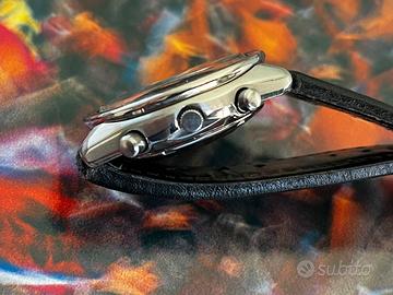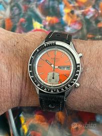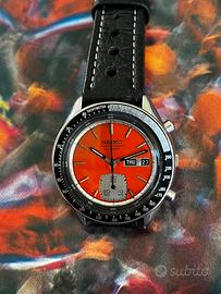 Cronografo Seiko 6139-6040 rilasciato nel Febbraio 1977 e denominato “gosth”. Mantiene perfettamente l’orario, il cambio data funziona come dovrebbe ed il cronografo resetta a 0 senza problemi. Quadrante arancione molto piu raro di quello argentato! Si tratta del solo orologio senza il suo bracciale in acciaio ma abbinato ad un cinturino in pelle stile racing.