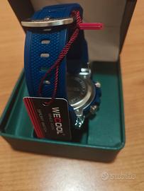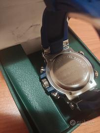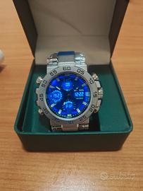 Orologio da uomo nuovo mai usato mai indossato diametro 44 , luce azzurra digitale e analogico. Cronografo, cronometro, data sveglie, fasi lunari ect. Cinturino in gomma di colore blu.