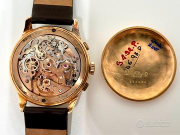 Vendo orologio cronografo Vetta cal 130 (Valjoux23 ruota a colonne) anni ‘50 in oro. In ottime condizioni come da foto e perfettamente funzionante, pulsanti fluidi e reset crono a ore 12. Revisione certificata ottobre 2023. A corredo scatola originale e secondo cinturino anch’esso in pelle. Possibile scambio a mano Roma zona Flaminia