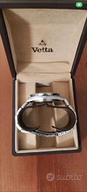 Cronografo Vetta anni 90 , omage al Daytona , movimento Valjoux 7750 , cassa in acciaio 41 mm, fondello serrato a pressione, ghiera in acciaio con scala tachimetrica, tasti a pompa, quadrante nero, grafica argento, indici applicati, contatore dei secondi a ore nove, contatore dei minuti a ore dodici, contatore delle ore alle sei, movimento a carica automatica, bracciale a maglie in acciaio, chiusura a scatoletta in acciaio marcata Vetta, vetro minerale. Con scatola , garanzia dell'epoca e maglie aggiuntive . Unico graffio degno di segnalazione è a ore 9 ,