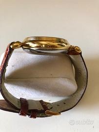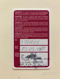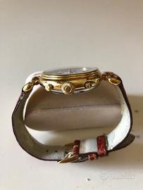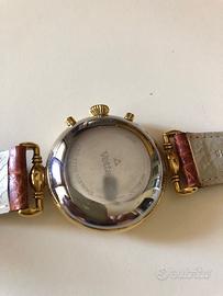 Cronografo Vetta del 1989 movimento Valjoux 7751 automatico, con contatore giorno della settimana e mese, contatore fasi lunari e contatore secondi; giorno del mese sul bordo del quadrante con lancetta a lunetta, pulsanti start-stop lancetta cronografo, pulsante per regolazione giorni. Cassa laminata oro, fondo acciaio, diametro 37 mm e spessore 12 mm, in buone condizioni generali ed estetiche. Laminatura dorata lievemente consunta sulle parti bombate delle anse del cinturino. Funzionante ma non revisionato/lubrificato. Cinturino non originale Morellato (da cambiare). Card garanzia, senza scatola originale. Vendo solo in Italia e paesi Unione Europea