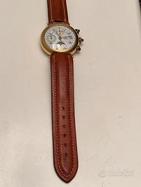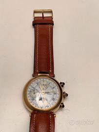 -Cronografo Vetta movimento Valjoux automatico del 1989, con contatore giorno della settimana e mese, fasi lunari e secondi. Il giorno del mese viene visualizzato sul bordo del quadrante con lancetta a lunetta. Pulsanti start-stop lancetta cronografo e per regolazione giorni; i tre pulsanti hanno ciascuno uno zaffiro incastonato. Cassa e fondo placcati oro, diametro 37 mm e spessore 12 mm. Solo ritiro.